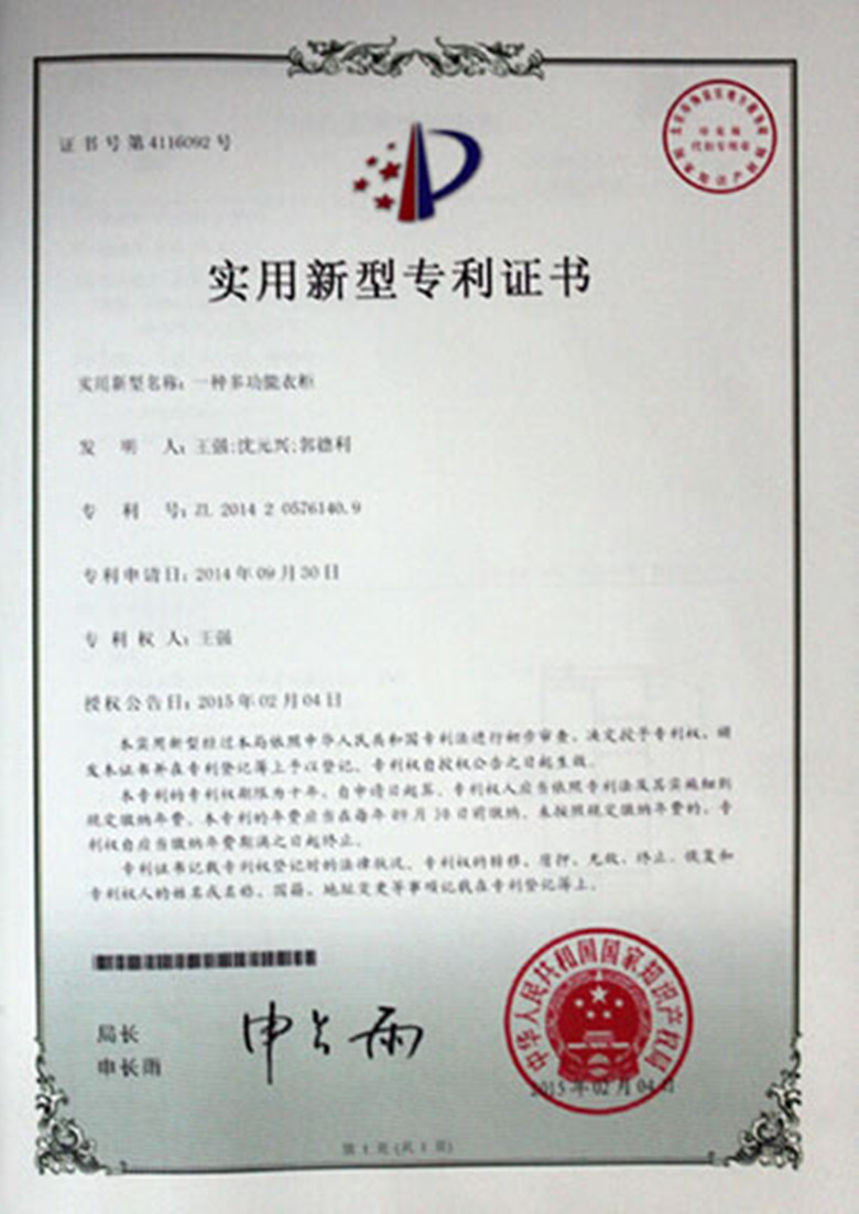 日前,由博彩平台推荐 机械工程系王强、沈元兴、郭德利三位同学设计的《一种多功能衣柜》作品获得国家知识产权局授予实用新型专利。专利号为:ZL 2014 2 0576140.9。至此,博彩平台推荐 学生获得国家专利数达5项。