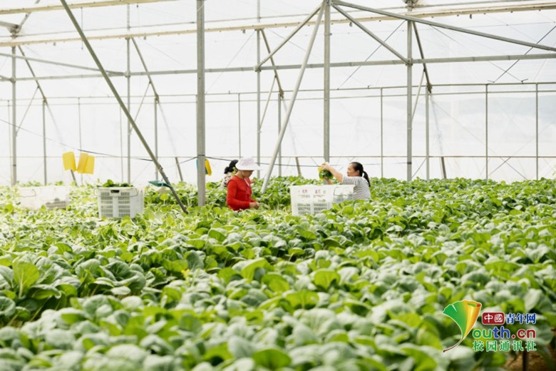 参观过后,团队来到了产业园的蔬菜种植园区,这里的农民们正忙着装苗罐、育苗、采摘。这里已经采用了无土栽培,水肥一体化滴灌等智能技术,这种区别于传统以土壤为基质的种植方式吸引了队员们注意,产生了浓厚的兴趣。