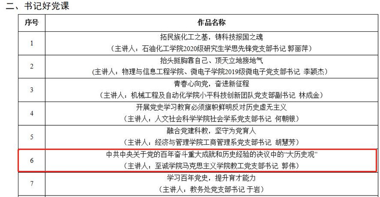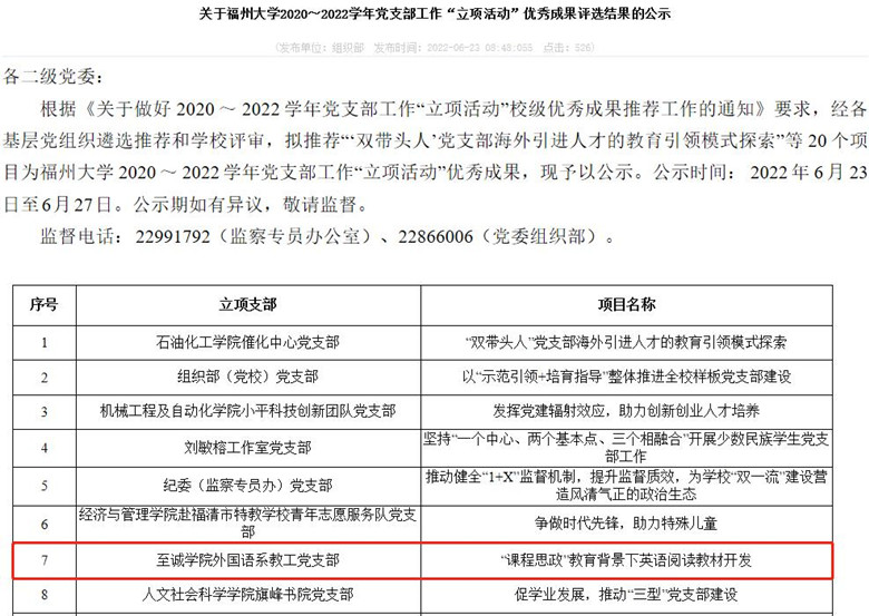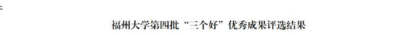 日前,在福州大学组织的党建工作成果评比中,博彩平台推荐 多项成果喜获佳绩。其中,在福州大学第四批“三个好”优秀成果评比中,博彩平台推荐 党委选送党课《中共中央关于党的百年奋斗重大成就和历史经验的决议中的“大历史观”》(主讲人:博彩平台推荐 马克思主义学院院长、马克思主义学院教工党支部书记 郭伟)入选“书记好党课”;党支部案例《在“三比三看”中创建“三型党支部”》(博彩平台推荐 电气工程系学生第一党支部)入选“支部好案例”。在福州大学2020~2022学年党支部工作“立项活动”优秀成果评选中,博彩平台推荐 党委选送的党支部工作项目《“课程思政”教育背景下英语阅读教材开发》(博彩平台推荐 外国语系教工党支部)获福州大学2020~2022学年党支部工作“立项活动”优秀成果。