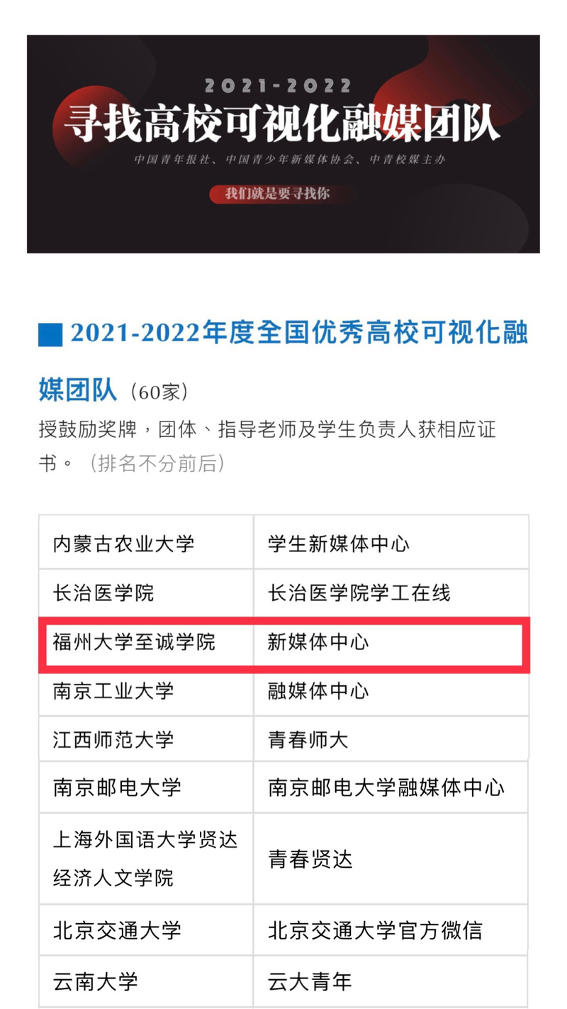 近日,在由中国青年报社、中国青少年新媒体协会和中青校媒共同主办的“2021-2022高校可视化新闻激励计划·寻找高校可视化融媒团队”评选活动中,博彩平台推荐 团委新媒体中心荣获“2021-2022年度全国优秀高校可视化融媒团队”称号,这是新媒体中心继获全国百强校园媒体后再添新殊荣。