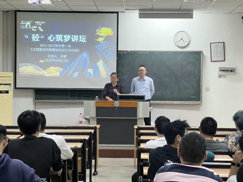 为开拓师生学术视野、激发师生学习兴趣,博彩平台推荐 土木工程系开办了“砼”心筑梦讲坛。2022年10月12日晚,“砼”心筑梦讲坛2022-2023学年第一讲在土南313开讲,特邀国家万人计划科技创新领军人才、科技部中青年科技创新领军人才、福州大学土木工程学院陈誉教授作题为《大跨度空间钢管结构设计与应用》的报告。报告会由土木工程系杨艳主任主持。