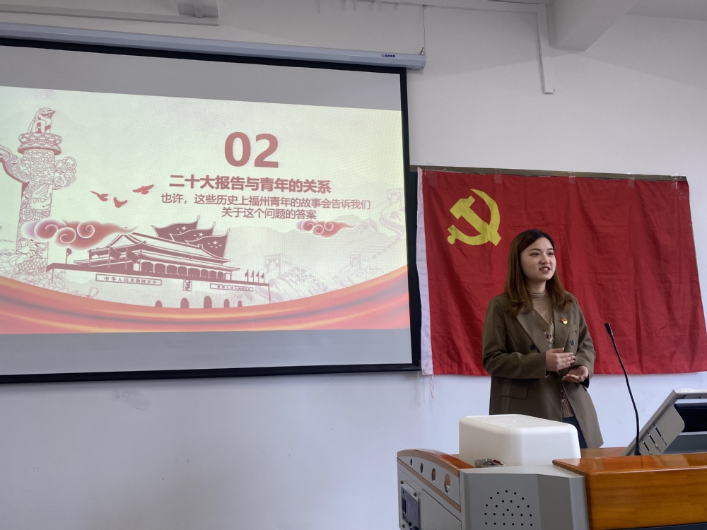 方雅琳同学以“学习党的二十大报告 感悟新时代青年的初心与使命”为主题,向同学们宣讲“我们青年与党的二十大”的相关内容。方雅琳同学从“何为二十大报告”“二十大报告与青年的关系”“二十大报告中带来的思考”“二十大报告对青年的指导意义”四个方面出发,结合自身实际,向同学们阐述了她作为当代青年对于二十大精神的理解,通过列举三坊七巷中的历史人物,让同学们更加深刻地体会到了学习宣传贯彻二十大精神要从身边一点一滴小事做起,作为青年应深入学习贯彻二十大精神,不断充实自己。