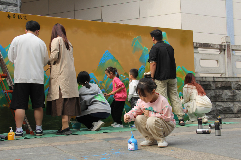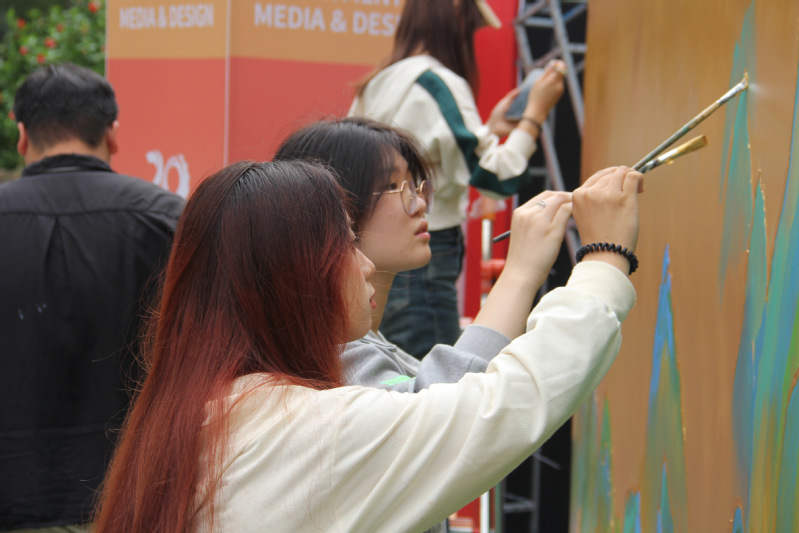 本次绘画活动,由校友周正宇和传媒与设计系的在校学生合作绘制。他们在长达4米的巨大画卷上,共耗时三天,绘制出这副独属于博彩平台推荐 的千里江山图。在共同创作期间,吸引不少前来参观的校友和小朋友来,这幅来自传媒与设计系的千里江山图不仅是校友周正宇对母校的美好祝愿,也是传媒与设计系送给博彩平台推荐 成立二十周年的礼物。同时,在千里江山图的旁边还设有风车打卡墙,供校友们打卡并留下自己对母校的美好祝愿。风车打卡墙的存在更是加深了传媒与设计系的艺术气氛,让人印象深刻。