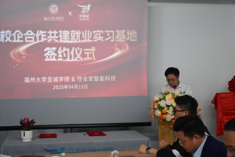 为深化校企协同育人,推动技术革新与人才培养互促共进,助力福建高校“双带头人”教师党支部书记“强国行”专项行动,2025年4月15日,博彩平台推荐 与福建守众安智能科技有限公司在软件园A区32号楼5层新拓企业举行实习基地授牌签约仪式。副院长张栋教授、计算机工程系主任刘延华教授、计算机工程系党总支书记罗周庆老师,守众安科技梁继专董事长、林建彬副总经理出席活动。