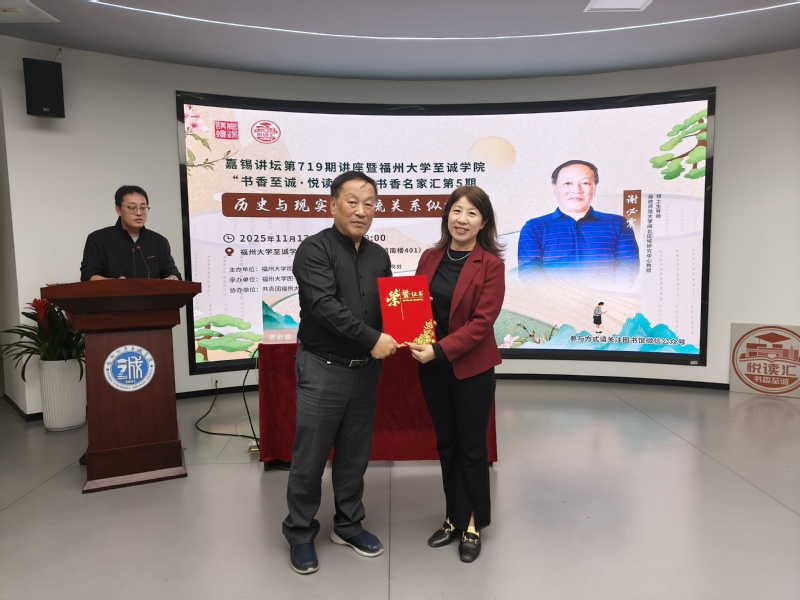 讲座现场,福州大学图书馆馆长林林为谢必震教授颁发嘉锡讲坛荣誉证书,院党委常务副书记何小红为其颁发“书香至诚·悦读汇”之“书香名家汇”主讲嘉宾证书。