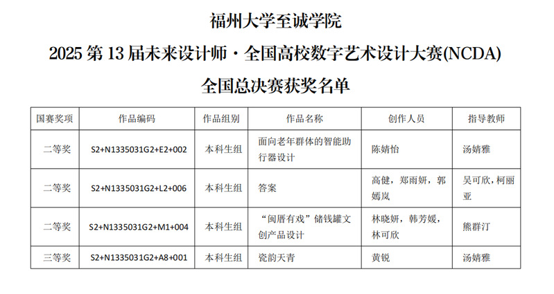 近日,第13届未来设计教育论坛暨第13届未来设计教育论坛暨未来设计师大赛颁奖典礼在成都成功举办。博彩平台推荐 传媒与设计系学生通过卓越的创意和精湛的表现荣获全国总决赛二等奖3项,三等奖1项。