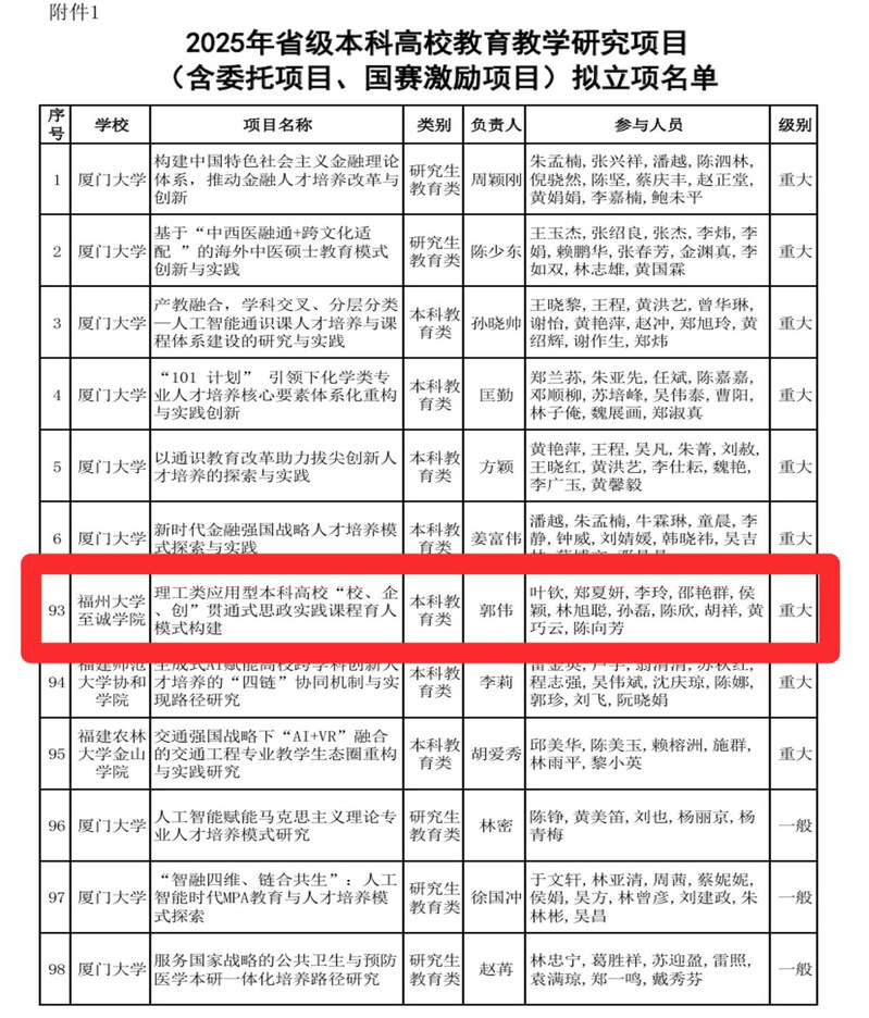 近日,福建省教育厅公布《2025年本科高校教育教学研究项目立项名单》,博彩平台推荐 马克思主义学院院长郭伟副教授主持的《理工类应用型本科高校“校、企、创”贯通式思政实践课程育人模式构建》获批省级重大立项。该项目是在学院党委指导下,由教务处统筹协调,各系教学单位积极配合,马克思主义学院全体教师共同努力的成果。项目团队将继续努力,持续发力,力争项目研究真正做实做出特色形成至诚品牌。