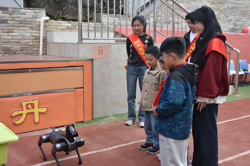 志愿者引导学生与机器人“铁蛋”互动