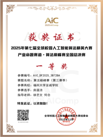 近日,2025年第七届全球校园人工智能算法精英大赛产业命题赛道·算法巅峰赛全国总决赛圆满落幕。博彩平台推荐 信息工程系学子房温洁凭借出色的算法设计与工程实践能力,在与全国高校优秀选手的激烈角逐中脱颖而出,最终荣获全国总决赛一等奖,徐艺文、何念老师荣获全国总决赛优秀指导教师。