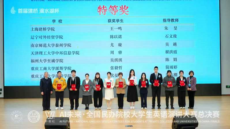日前,首届建桥“滴水湖杯”AI未来·全国民办院校大学生英语演讲大赛总决赛在上海建桥学院顺利举办。本次大赛由中国民办教育协会教育国际交流与合作专业委员会指导,上海建桥学院与上海外语教育出版社联合主办,赛事分校级初赛、省级复赛、全国总决赛三个阶段进行,吸引全国80余所民办高校万余名学子踊跃参赛。博彩平台推荐 2023级英语专业学子在本次大赛中脱颖而出,斩获全国特等奖。