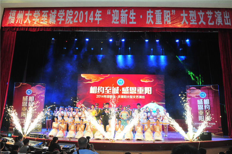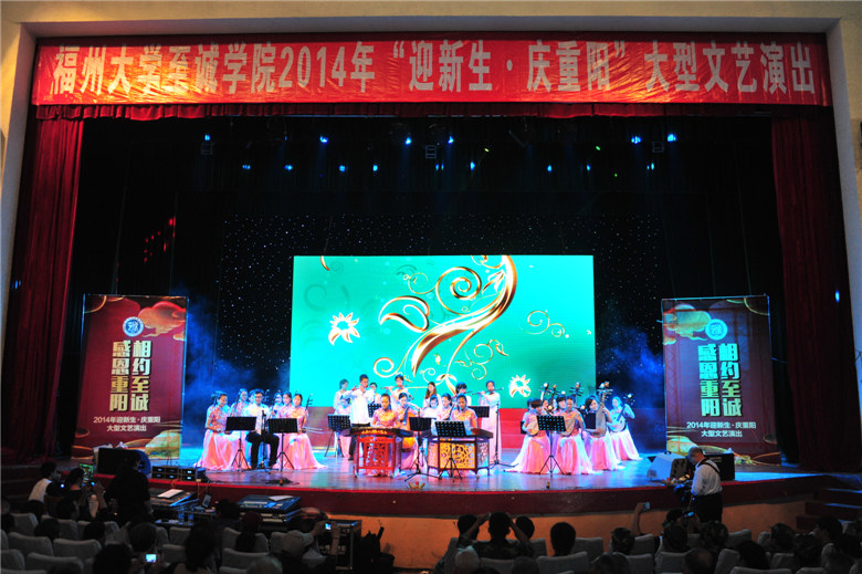 2014年“迎新生·庆重阳”文艺演出在逸夫馆举行。福州大学离退休处张海滨处长,福州大学离退休处陈善忠副处长,2014级军训团政治处主任朱耀斌少校,院党委专职副书记李文涛副教授,院党委副书记雷石宝老师,副院长朱敏琛教授,院长助理兼两办主任林行老师等领导嘉宾,部分2014级新生与部分福州大学离退休老教师一同观看了演出。